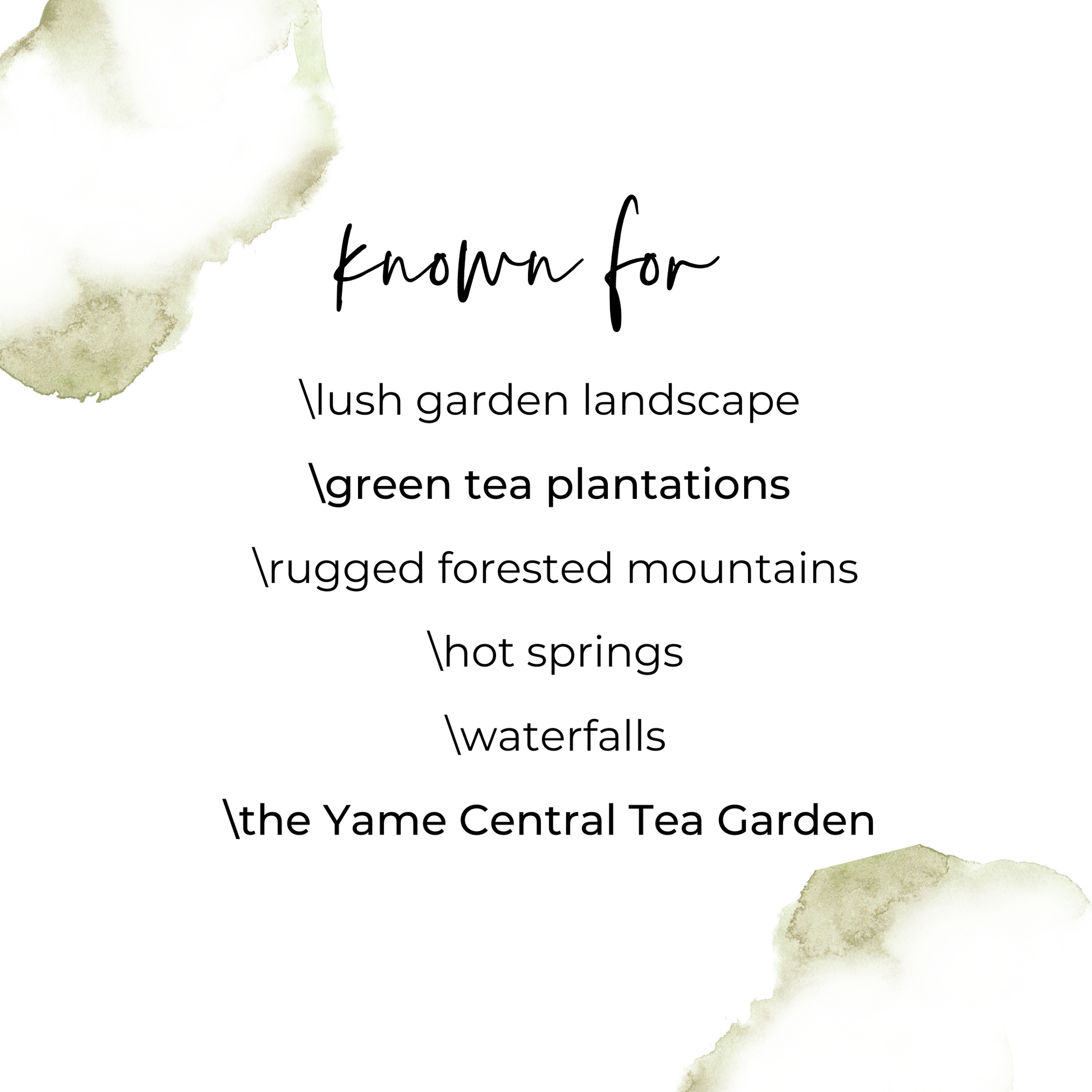 Yame is an old castle town known for its its lush garden landscape and green tea plantations nestled amidst rugged forested mountains, hot springs, waterfalls, and the Yame Central Tea Garden. Yame remains a picture-perfect slice of traditional Japan, thanks to the talented artisans who have made Yame their home since the 1600’s.